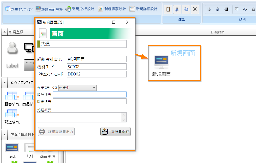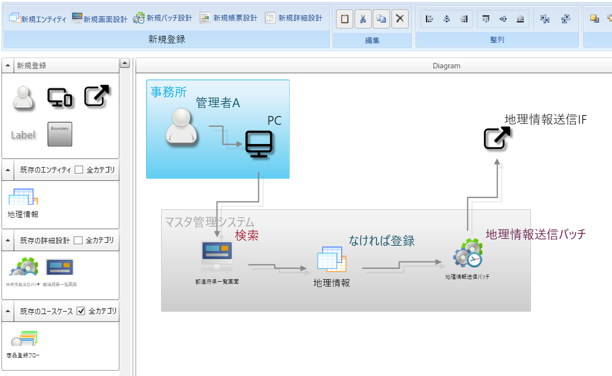 ユースケースを構成する画面・バッチやエンティティなどユースケースを定義する段階では まだDevelosに登録してない場合が多いです。 ユースケースを構成する各種オブジェクトをユースケース定義画面から基本情報のみを登録して後から詳細を登録することができます。