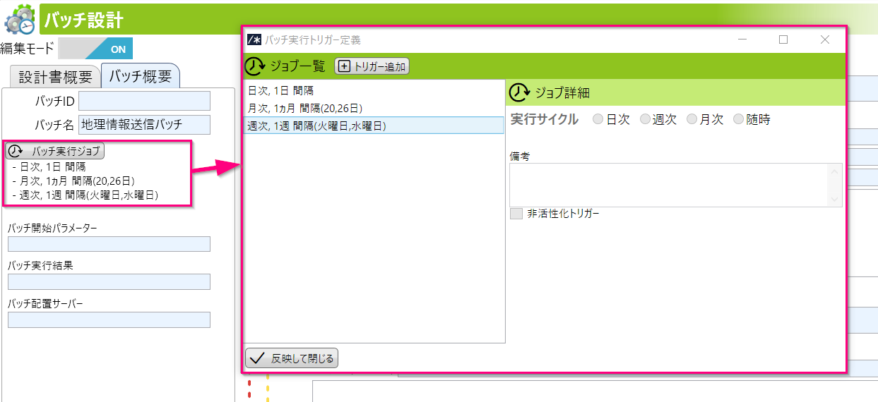 バッチ設計の概要にジョブを定義することができます。 ジョブは一般的に使われる定期・随時を選ぶことができ、 定期の場合は日次・週次・月次や実行開始時刻などを指定できます。