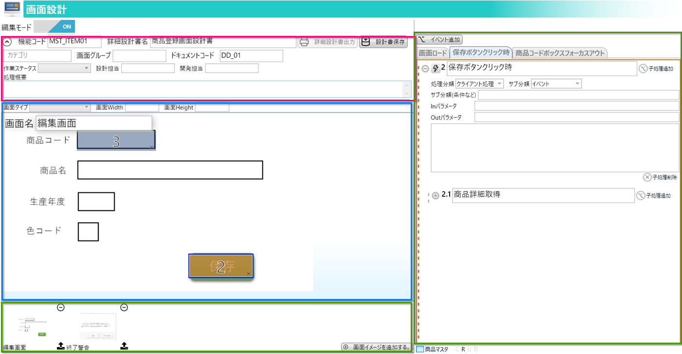 画面サンプル、項目定義、イベント定義はごく一般的な画面設計書のフォーマットです。